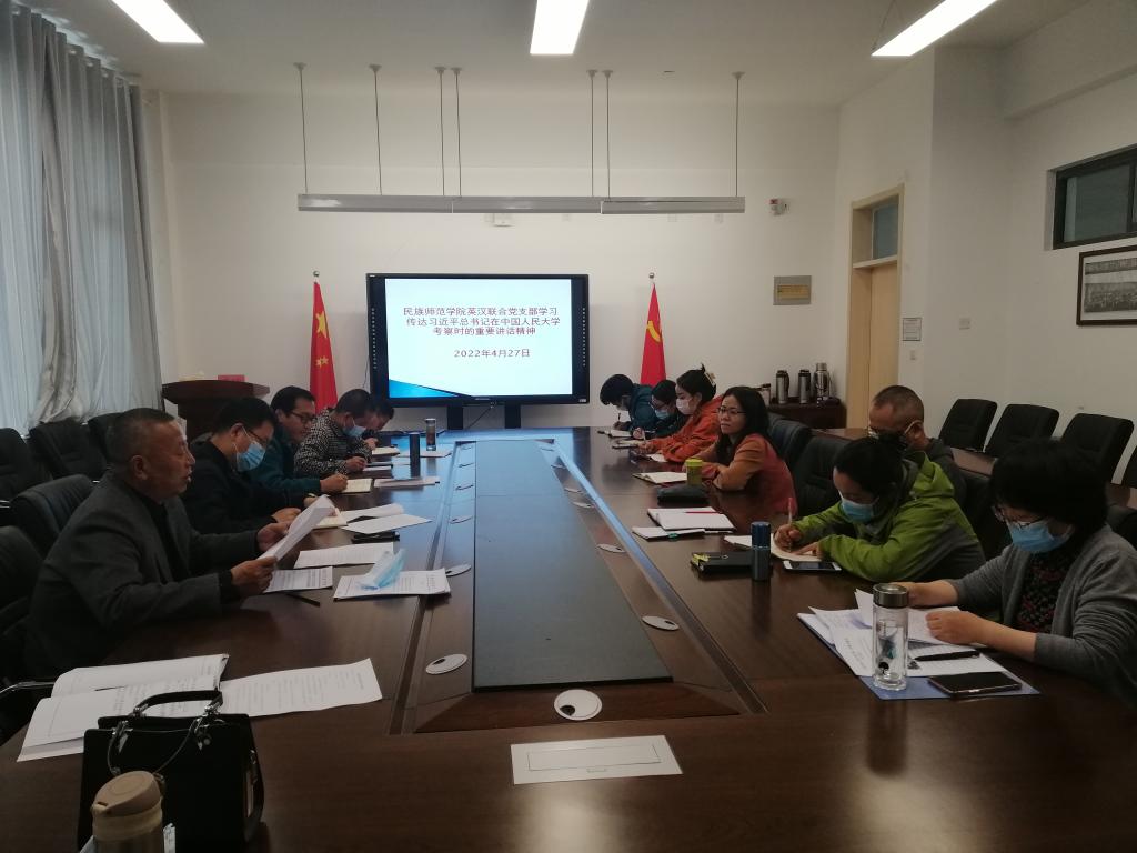 4月27日下午,英汉联合党支部组织全体党员和英语教研室全体教师一起学习习近平总书记在中国人民大学考察时的重要讲话。会议由党支部书记祁好道主持。通过前期微信平台和集中学习,广大教师和党员同志对习近平总书记的重要讲话有了更加深入的了解和认识。习近平总书记的重要讲话对我国高等教育办学发展方向提出了明确的要求,为思政课建设和教师队伍建设指明了方向。大家纷纷表示在今后的工作中继续认真学习领会、全面贯彻落实习近平总书记重要讲话精神,时刻牢记立德树人根本任务,努力探索任教课程的思政元素,为民族地区基础教育培养新时代“四有”新人。