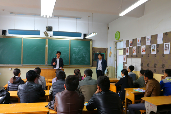 招聘会上当雄县中学党支部书记钻珠介绍了当雄县人才引进计划和当雄县中学情况。随后,当雄县教育体育局党总支书记、局长仁青介绍了招聘政策,并对同学们关心的招聘岗位、岗位待遇和考试要求等问题进行了解答。